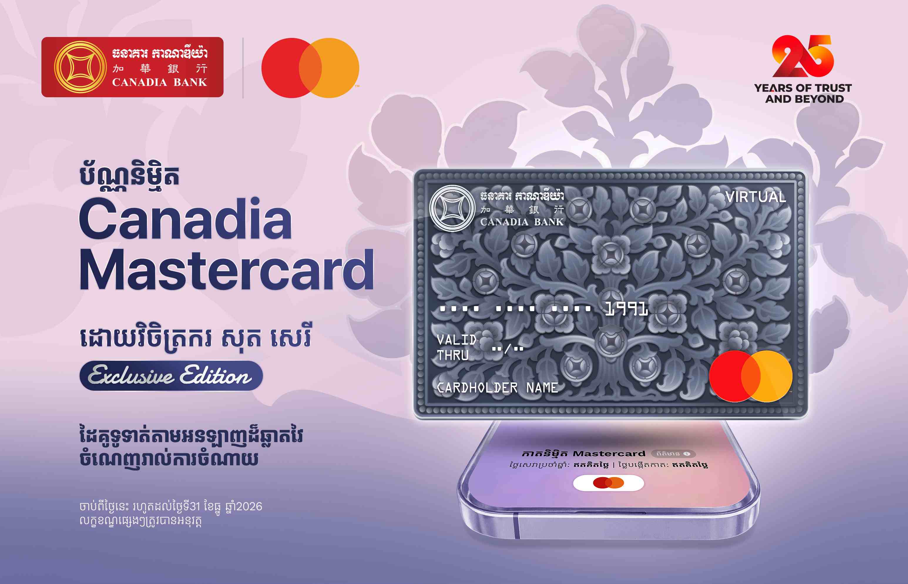 To mark 25 years with Mastercard, Canadia Bank introduces the new Mastercard Debit Virtual Card designed by artist Serey Sok — featuring 100% first online-purchase cashback, up to 25% monthly cashback, partner perks, and rewards with every payment. Open instantly and free in the New Canadia Bank App.