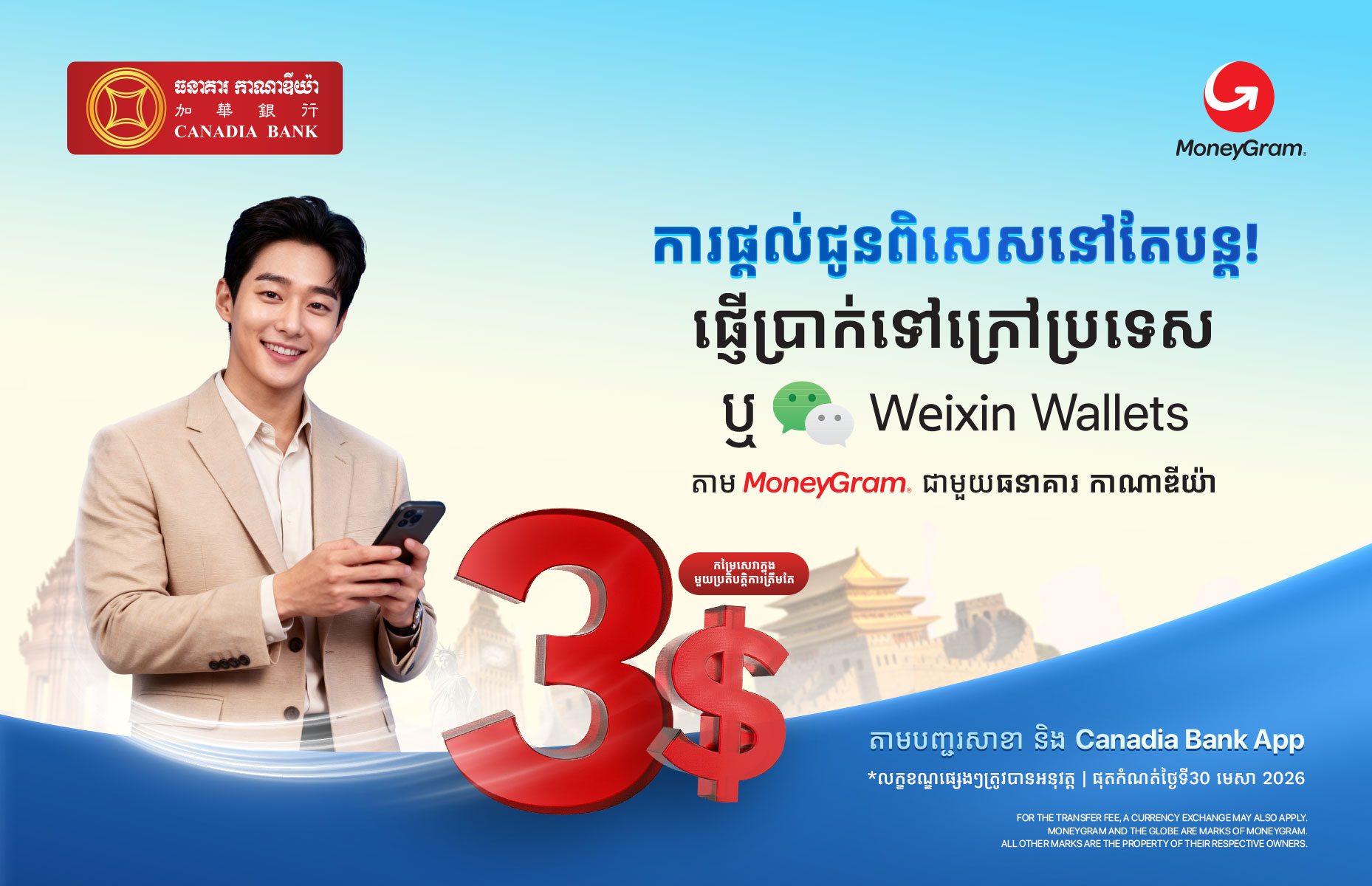 Enjoy free parking, fast track service, lounge access, discounts, a free airfare ticket, and exclusive gifts at Canadia Bank’s new Techo International Airport (KTI) branch. Open an account and pay with your Canadia Visa, Mastercard, or Canadia Bank App for a chance to win!